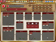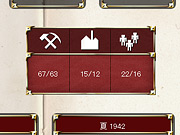 完成ターンが示されたボックスが並ぶ生産画面。生産中のユニットは1ターンごとに時計回りで移動していき,最終的には左上のボックスに移って,次のターンに配備される。ボードゲームではおなじみの「生産スパイラル」だ。画面中央に,資源/工場/人口のポイントが示されている