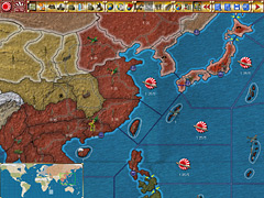 結局のところ,まず中国沿岸部を押さえ,内陸部は爆撃でダメージを与える(中国内陸部は「占領」しなければ,日本にとって不利な状況にはならない)。資源供与が切れる41年春以降の適当なところで,西側連合と開戦して東南アジアに進出する。ここで資源を確保してさらなる攻勢を図る……という,史実を踏襲するスタイルが基本になってしまうだろう。 東南アジアの諸領域には人口ポイントが設定されていないから,ゲリラは発生しない。中国内陸に進出するよりも,日本軍の戦略としてはまず南方の資源地帯を先に押さえたほうが合理的といえるのだ。また,日本のゲーム開始時点からの支配領域と,中国沿岸部〜東南アジアの資源ポイントの合計を見てみると23ポイント。したがって日本は,まずは工場をフル稼働させられる資源を確保すべく,これらの地域を手に入れることを考えるべき,となる。 また,あえてソ連を先に攻撃するというオプションもある(これは英文マニュアルの13.2.1節でも触れられている)。東南アジアやハワイなどに手を出さなければ,アメリカは1943年になるまで日本やドイツに宣戦できない(ただし,その間アメリカはフリーハンドで軍備と備蓄に専念できることになる)。史実と大きく違った展開を求めるのならば,試してみてもよい戦略かもしれない。