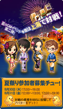 [URL] ゲームポータルサイトGameChu(ゲームチュー)では、夏休み期間のオンラインイベントとして、GM対戦イベントを行っております。今回はその第二弾として、簡単に誰でもチャレンジし易いパズルゲームから、「上海」での対戦イベントを行う事になりました。今回は、イベント時の画像・感想を寄せてくださった方の中から抽選で20名の方に、イベント特製アバアーをプレゼント致します。