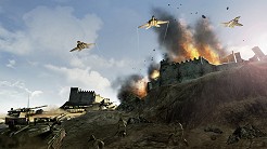 目標は,マップの各所にあるストラテジックポイントと呼ばれる場所となる。歩兵を突入させれば占領状態になり,このポイントを溜めることによって攻撃衛星や空爆などのサポートを受けられる。デモの最後には,攻撃衛星からいくつものペネトレータを地上の敵に打ち込むといった派手なシーンが見られた。