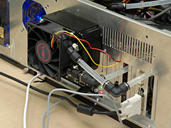 左はラジエーター部。動作中はかなりの騒音を発する。「ごく普通に買える物ですよ」とはROCX氏の弁だ。右の写真に見える水枕は「普通には買えないかもしれない」そうだが,自作などではなくメーカー製