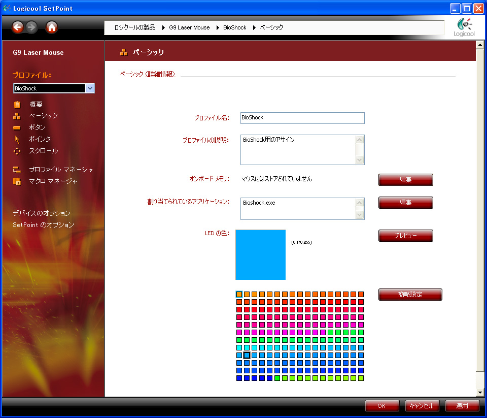 さて,SetPoint 5.0だが,従来バージョンと比べるとシンプルで「コントロールパネルらしくなった」感じである。基本的なマウスの操作設定に関する部分だと,従来のSetPointと大きな違いはないものの,LEDの色を設定したり,プロファイルに名前を付けて本体に保存したり,あるいはファイルとして書き出したりできるようになっているのは,G9用ならではといったところだ。