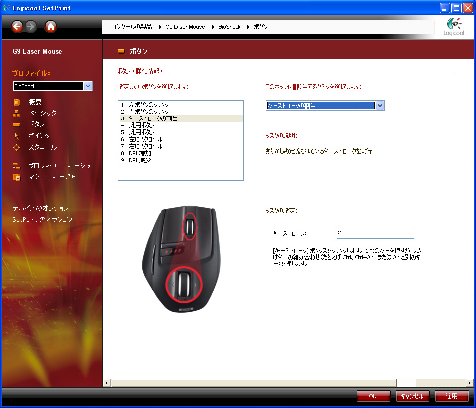 「最強のカスタマイズマウス」として見た場合のポイントは,ドライバソフト「SetPoint 5.0」と,本体に内蔵のフラッシュメモリだ。G9では,SetPoint 5.0で設定した以下の設定項目を,最大で5パターンのプロファイルとしてG9側に保持できる。