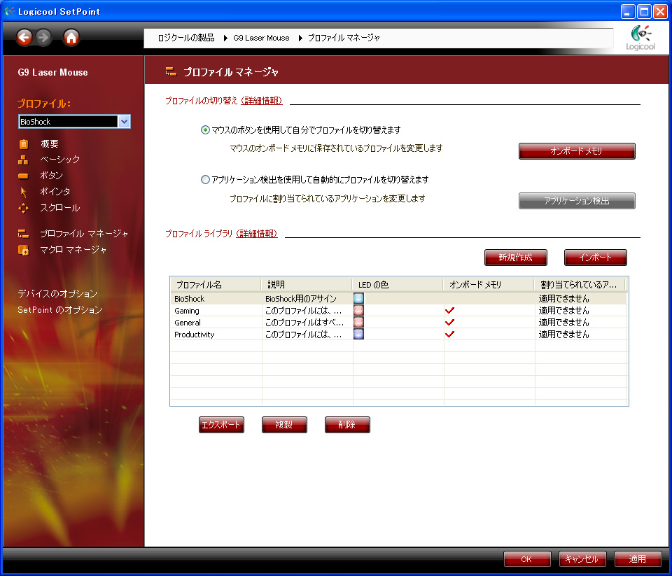 また,先にプロファイルはマウス底面のボタンを使って切り替えると述べたが,従来どおり,アプリケーションごとに自動変更されるようにも,SetPointから選択して指定できる。