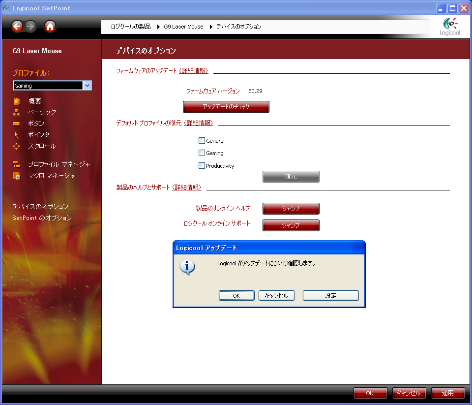 「ようだ」としたのは,β版で用意された[アップデートのチェック]ボタンをクリックすると,ドライバのアップデートをチェックしに行っているように見えたため。最終的にファームウェアを検索できるようになるのか,単なる日本語訳のミスで,製品がリリースされるころには「ドライバのアップデート」になっているのかは,Logitechの開発チームのみが知るところである。