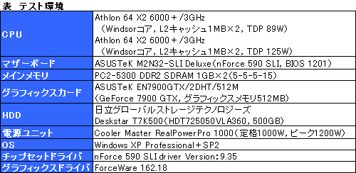 では,コア電圧の低下は,扱いやすさにどれだけの違いをもたらしているだろうか。今回は消費電力とCPUのコア温度を中心にチェックし,念のためベンチマークレギュレーション4.0から「3DMark06 Build 1.1.0」(以下3DMark06)と「ロスト プラネット エクストリーム コンディション」の体験版(以下ロスト プラネット)を利用して,性能に違いがないかも確認してみることにしたい。 なお,ベンチマークレギュレーションの最新版は4.1だが,今回は時間の都合で,Steamからのクライアントダウンロードが間に合わなかったため,4.0準拠としている。この点はご了承を。 このほかテスト環境は表のとおりだ。