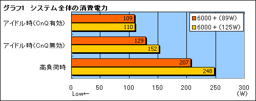 さっそく,気になる消費電力の検証から行ってみたい。 ここでは,OSの起動後30分間放置した直後を「アイドル時」,CPUだけに負荷を掛けるべく,MP3エンコードソフト「午後のこ〜だ」をベースとするベンチマークソフト「午後べんち」を30分間実行した状態を「高負荷時」とする。Athlon 64 X2 6000+は,省電力機能「Cool’n’Quiet」(以下CnQ)をサポートするため,アイドル時についてはCnQ有効の場合と無効の場合のそれぞれで消費電力を確認することにし,それぞれにおけるシステム全体の消費電力をワットチェッカーで計測した。その結果をまとめたものがグラフ1である。