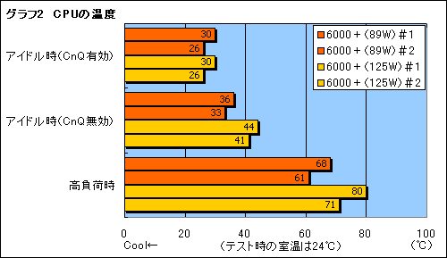 これを見ると,CnQ無効時の違いが大きいと分かる。アイドル時でも,TDP 89W版はTDP 125W版より20W程度低く,高負荷時には40Wもの差が生じている。期待どおりのスコアが出ているといっていいだろう。