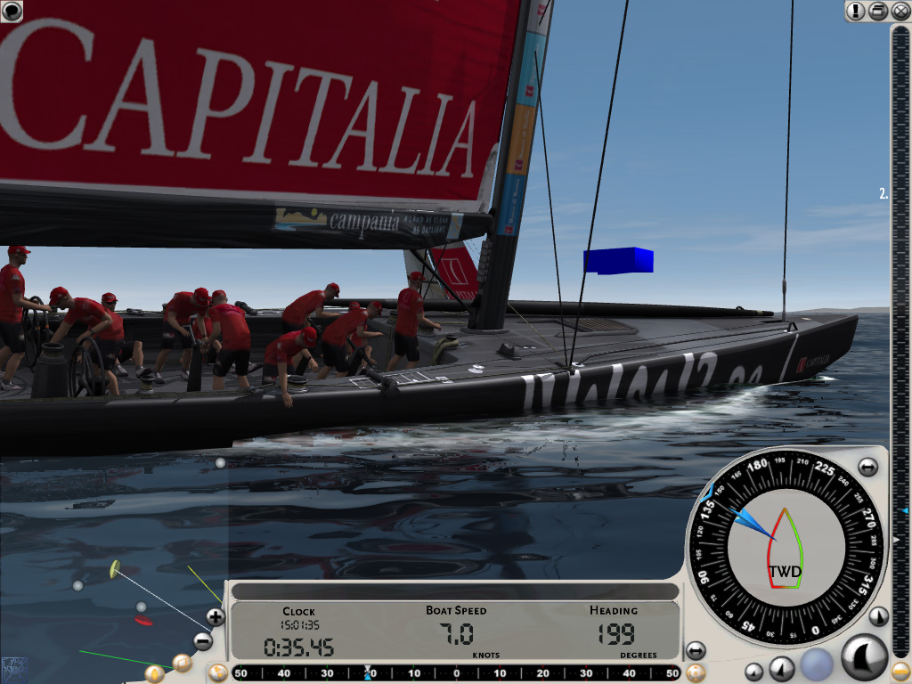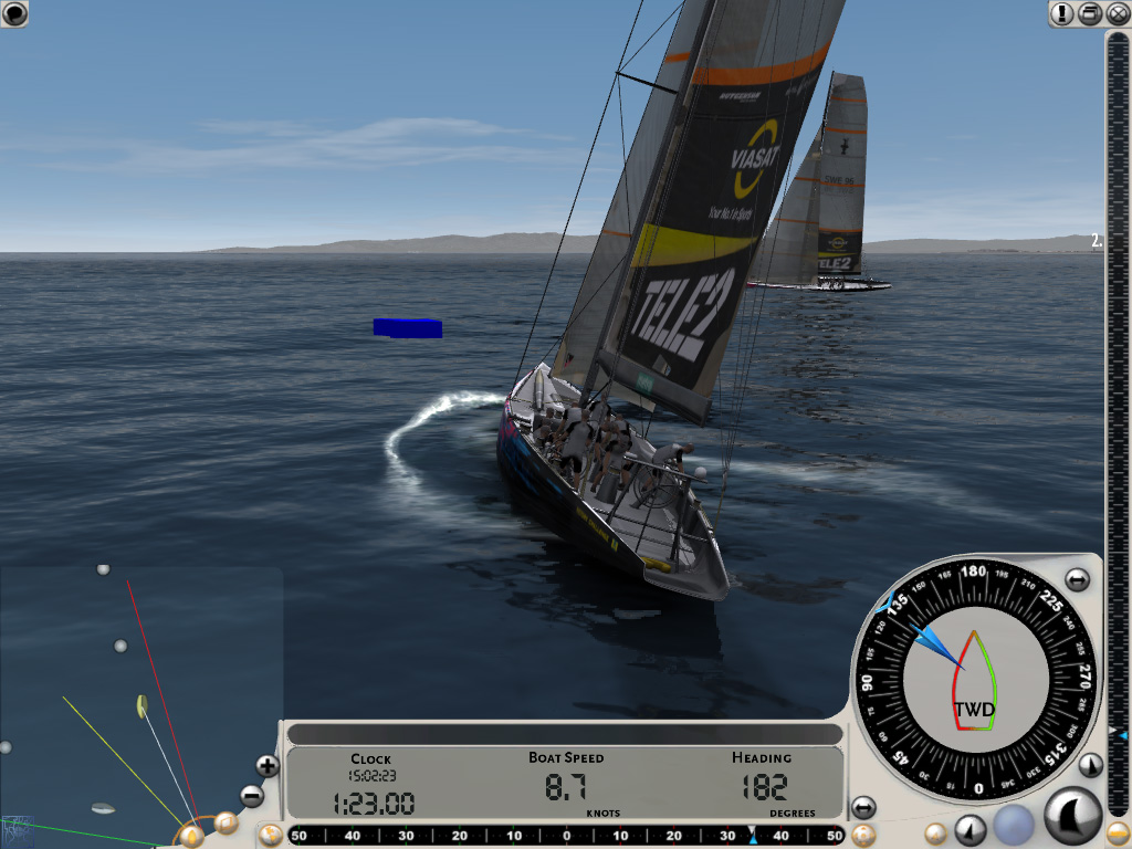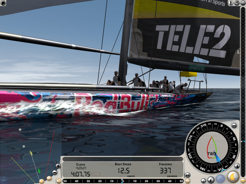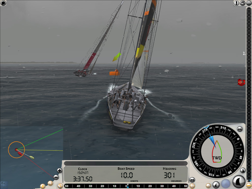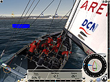 ちなみにレースがスタートしても,画面下部の時計が0になる前にスタートラインを横切ってはいけない。数十秒の余裕が設けられているのは,この間に適切なセールを張り,目標に向けて最も良いと思われる針路に艇を向けるためだ。