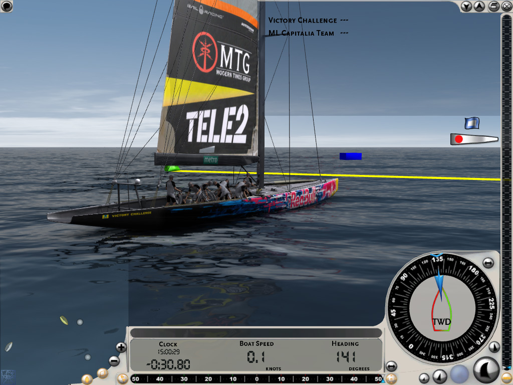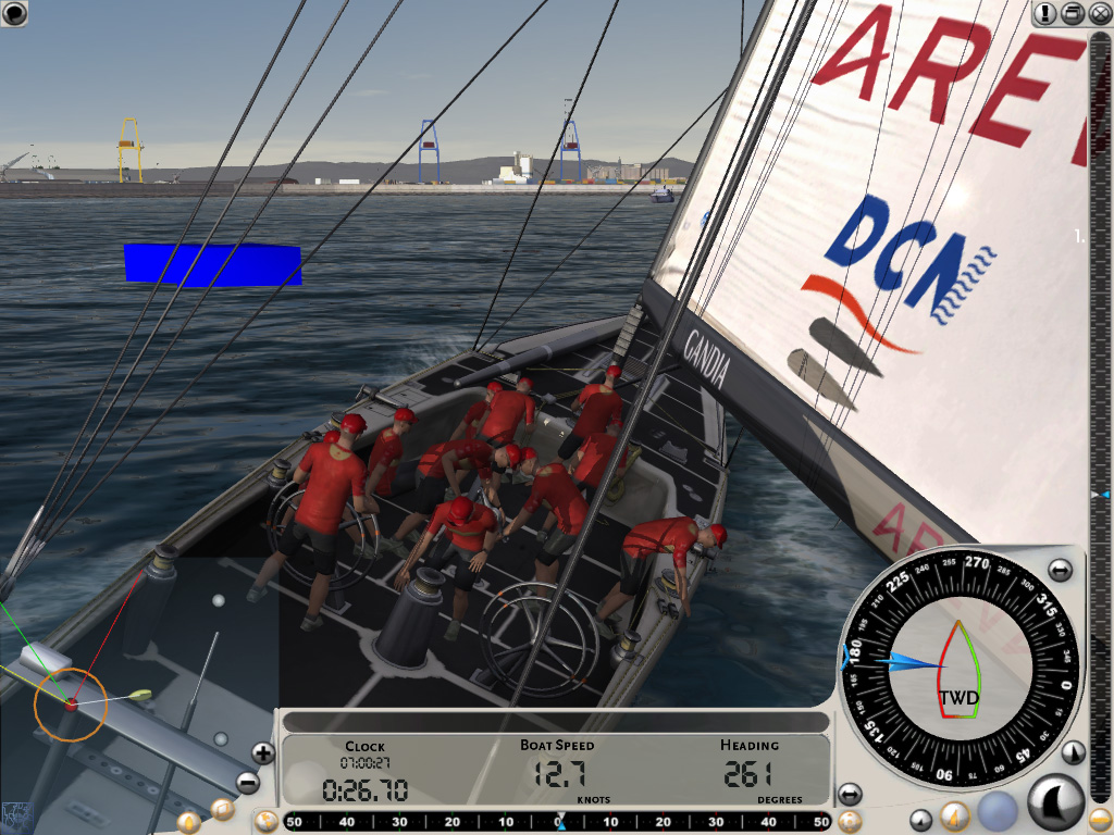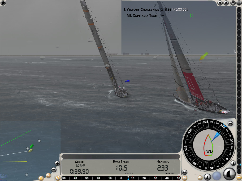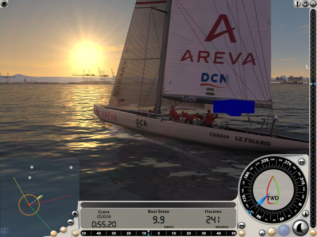ちなみにレースがスタートしても,画面下部の時計が0になる前にスタートラインを横切ってはいけない。数十秒の余裕が設けられているのは,この間に適切なセールを張り,目標に向けて最も良いと思われる針路に艇を向けるためだ。