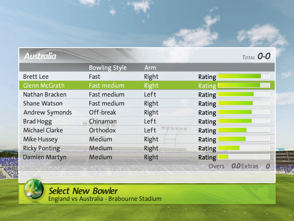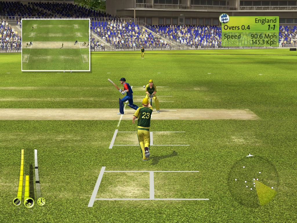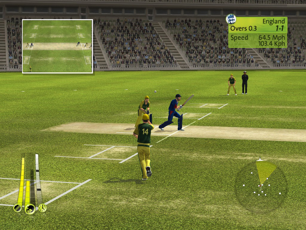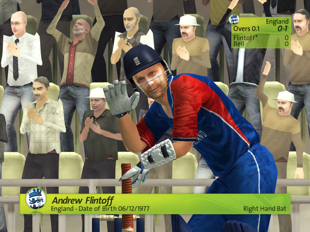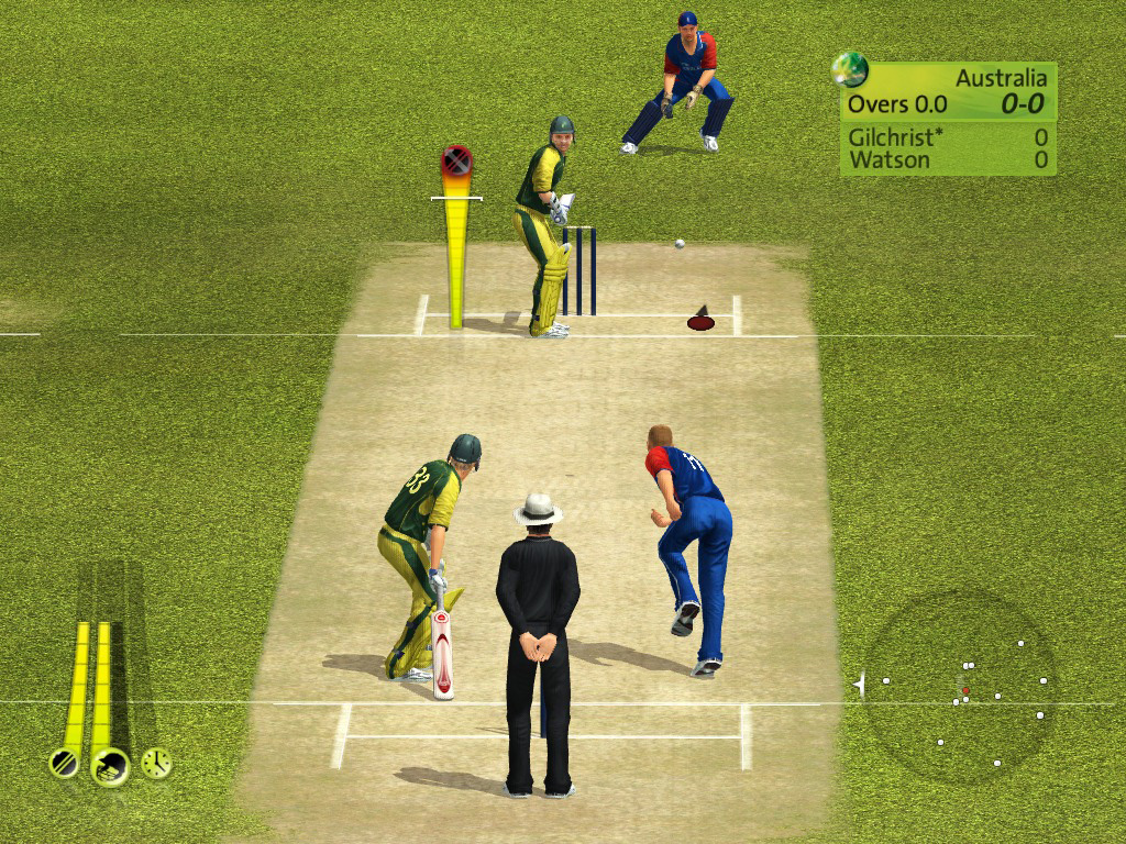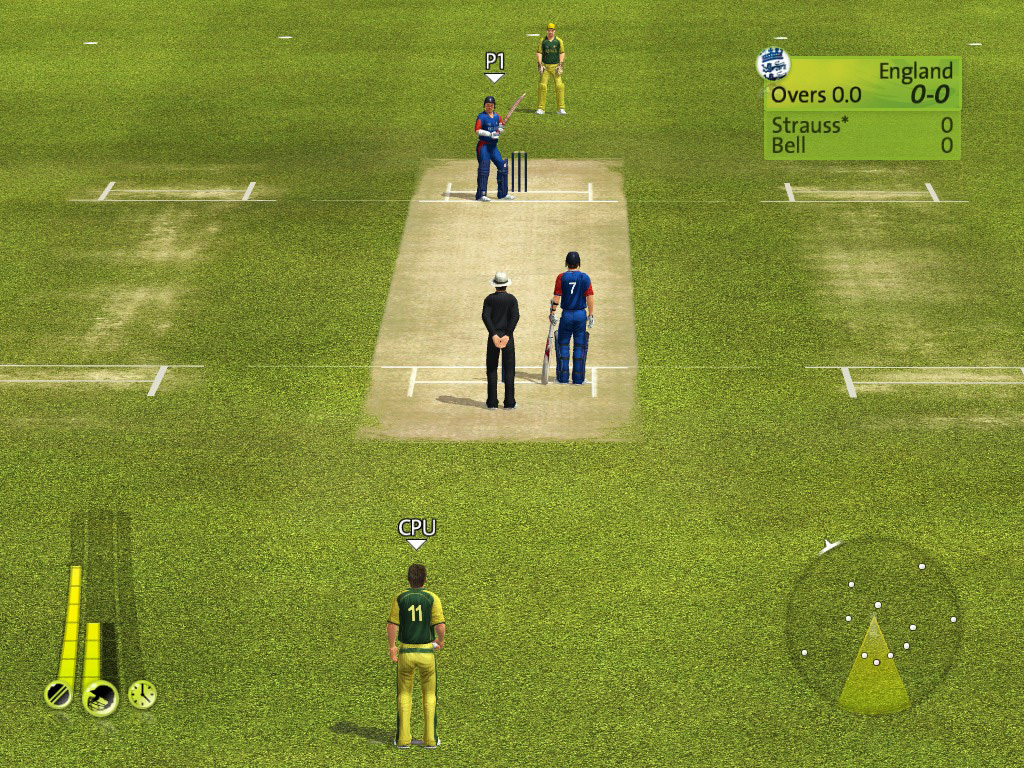 プレイヤーはイングランドチームとなり,最初にバッツマン(打者)を操作する。ウィケット(立てられている棒)を倒されないようにしながら点を稼いでいこう。