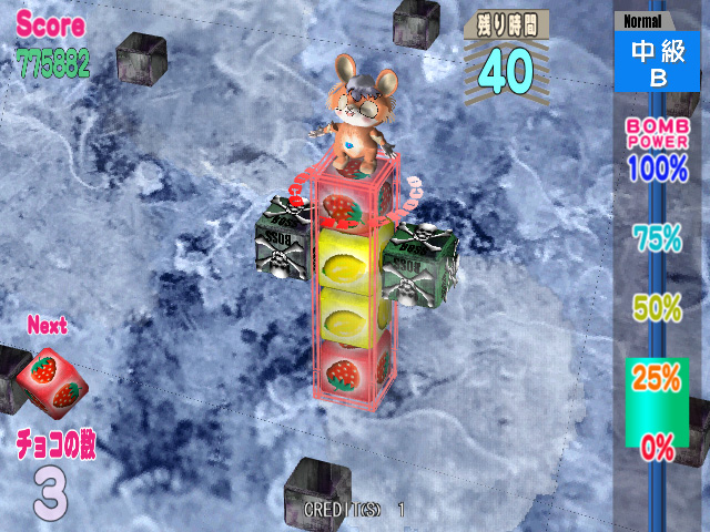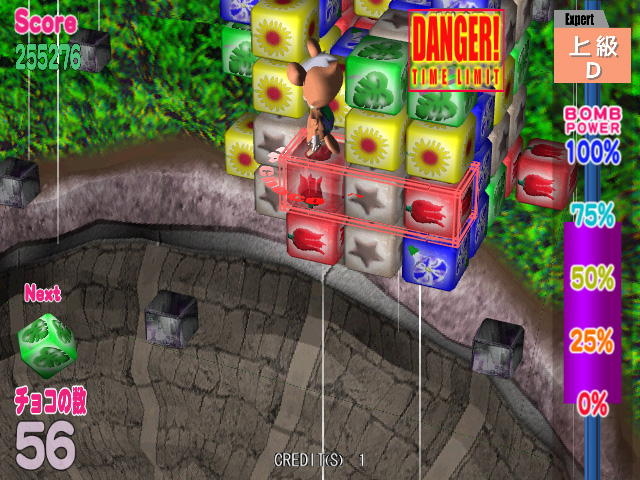 さて,直方体に積み上げられたチョコは,赤,黄,緑など数種類あり,プレイヤーは“ムサピィ”という可愛いキャラクターを操ってゲームを進める。チョコは,同じ色のチョコで別の色のチョコをはさむことで消えてくれるのだ。