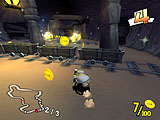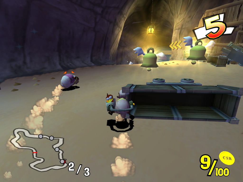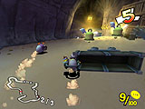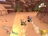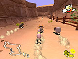 コース上には,コインや鐘などが置かれており,拾うと特殊なアイテムを獲得できたりする。注意したいのは,コースのところどころにいるサソリやバッファローで,接触すると吹き飛ばされたりして大幅なタイムロスとなってしまう。
