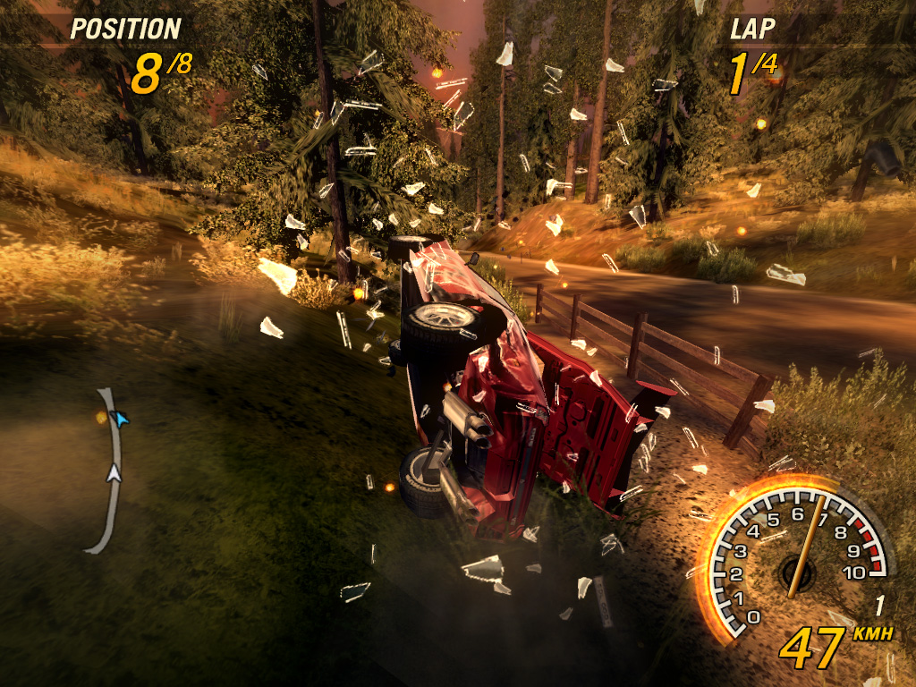 「Flatout 2」は,ライバルカーを蹴落としつつ勝利を目指すレースゲームだ。普通じゃないのは,勝利のためなら自分の車をライバルにぶつけたり,わざとコース脇の電柱に体当たりしてなぎ倒し,後続車の進路を妨害したりといった手段が許されていることだ。