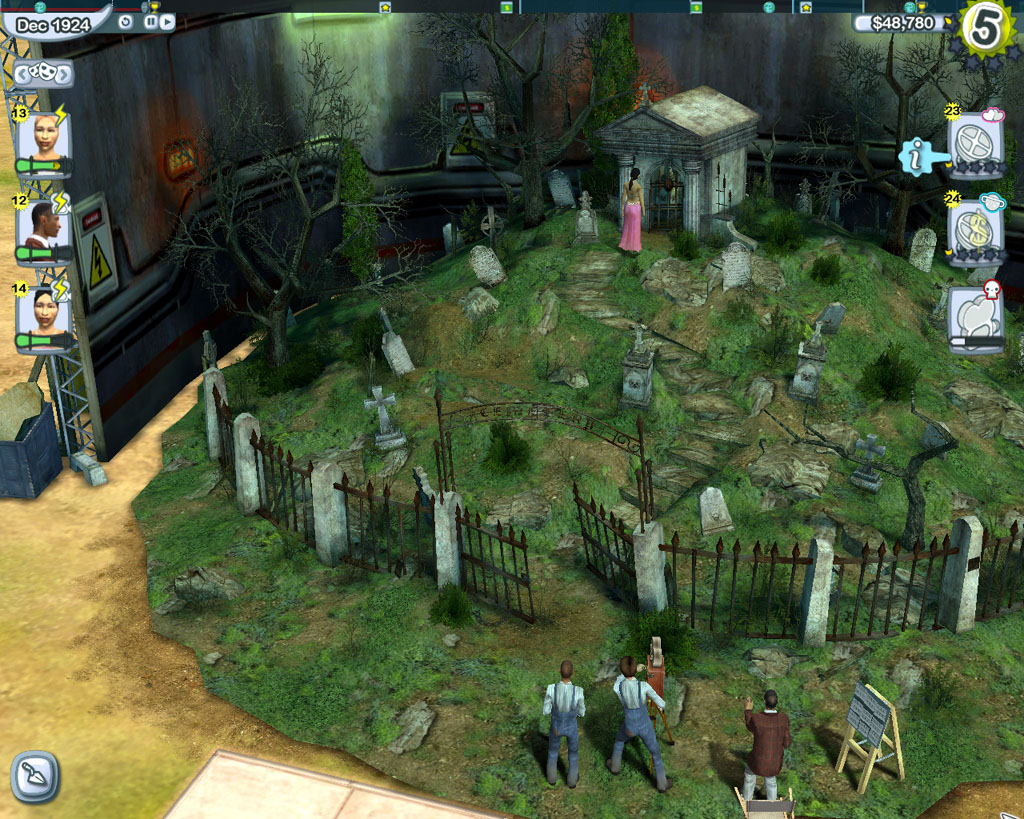 Start Demoは,大通りに面した,だだっ広いさら地が舞台となっている。まずは,スタッフオフィスの前に並んでいる求職者達を雇い,清掃員と建設員を確保。続いて,「Stage School」で映画制作に不可欠な俳優や監督を,「Crew Facility」で制作スタッフを養成しよう。例えば,さっきまで掃除していた人を俳優として抜擢するといったことも可能だ。