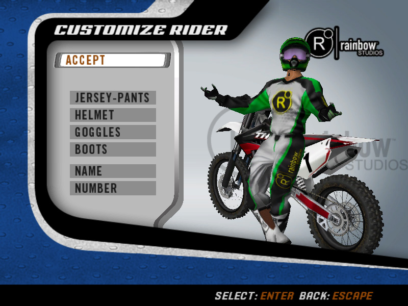 屋外に造られた各コースは山あり谷ありで,そこを全速力で走りながら華麗なジャンプを決めていく。シミュレーション的な要素はほとんどなく,モトクロスのアクロバティックなレースを大げさかつ乱暴に楽しもうといったコンセプト。マシンやライダーへのダメージというものもまったくないので,派手にジャンプしまくって,邪魔な敵車には体当たりをかましてやっても大丈夫である。なお,マシンの細かいセッティングはできないが,マシンやレーサーが着ているレーシングスーツのデザイン,カラーリングなどは変更が可能だ。