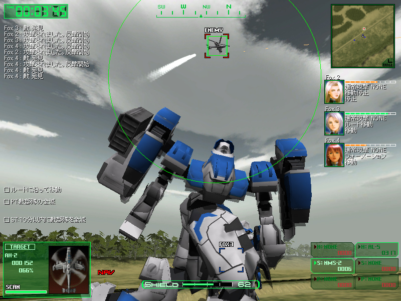体験版では,"渓谷を舞台に集結しつつある敵を偵察する"という体験版専用のミッションが楽しめるようになっており,ブリーフィング,小隊編成(機体変更,装備変更,搭乗員変更),オプション設定など基本的な機能は一通り操作可能だ。選べる装備や機体に制限があるが,購入の参考にするには十分な体験版だといえるだろう。(Murayama)