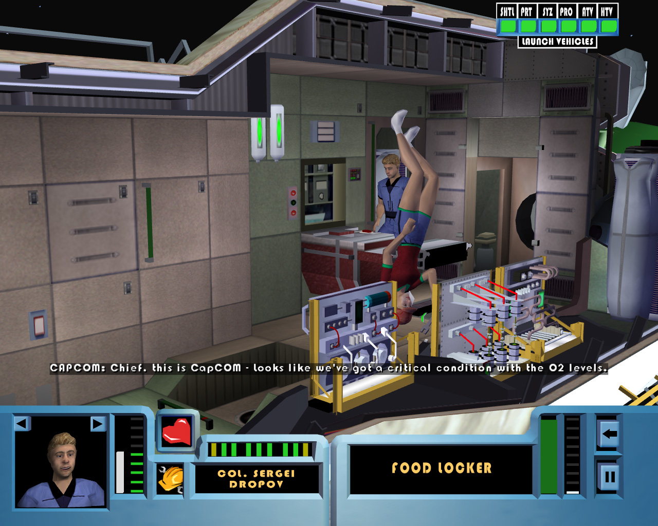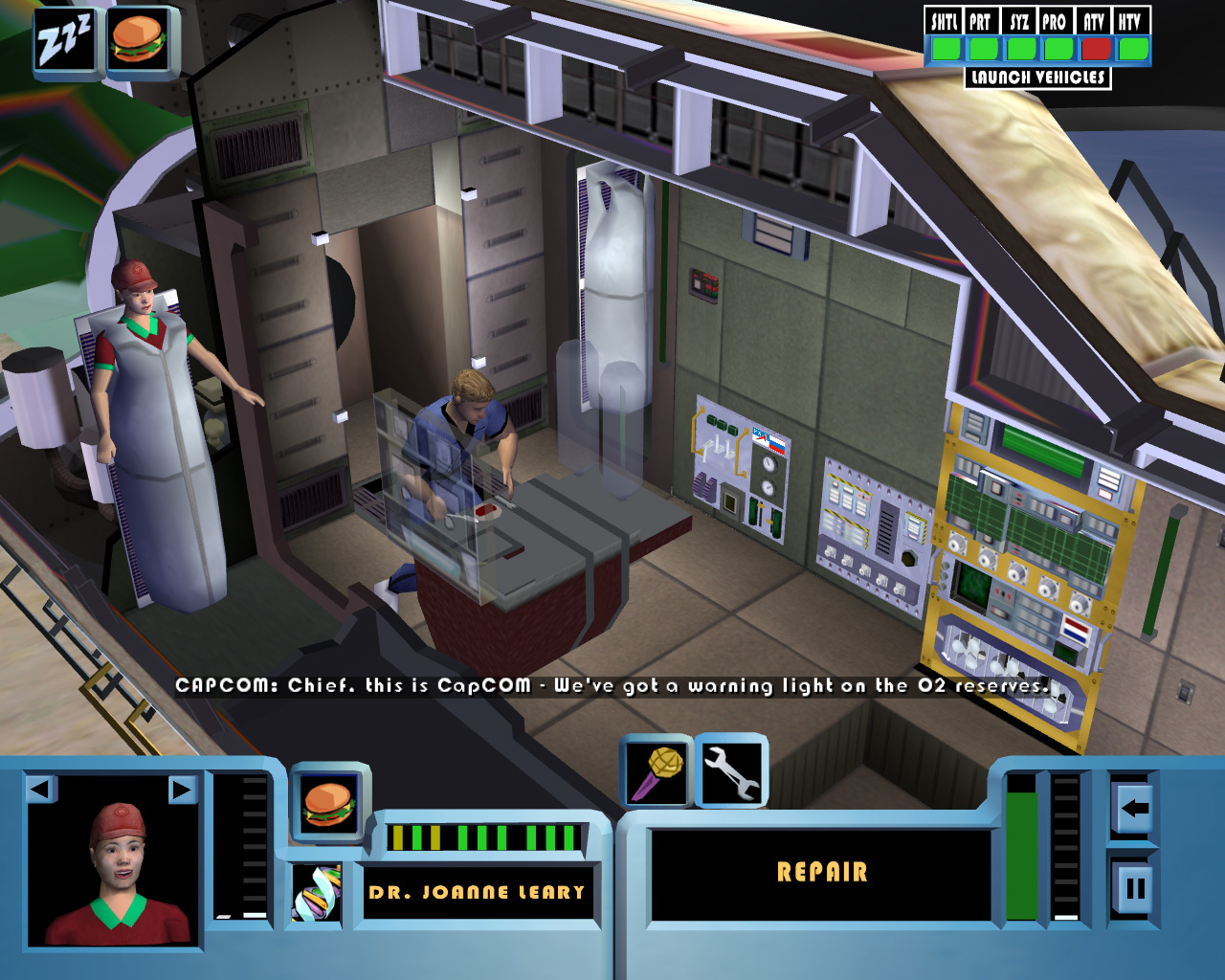 ステーション内部はかなり簡略化されており,プレイヤーが指示できる項目はあまり多くはない。調子の悪い機械を整備させたり食事や睡眠を取らせたりなど,飛行士達の体調に気を使いながら日々の業務をこなさせていこう。