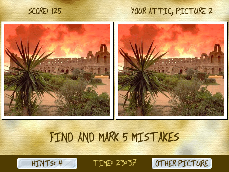 間違いは「え,これかよ!」というような細かいものもあるので,かなりの集中力が必要になる。どうしても分からないときは,画面下の“HINT”ボタンを押すとヒント(というよりは,答えそのもの)が表示されるが,トータルで5回までしか使えないのだ。