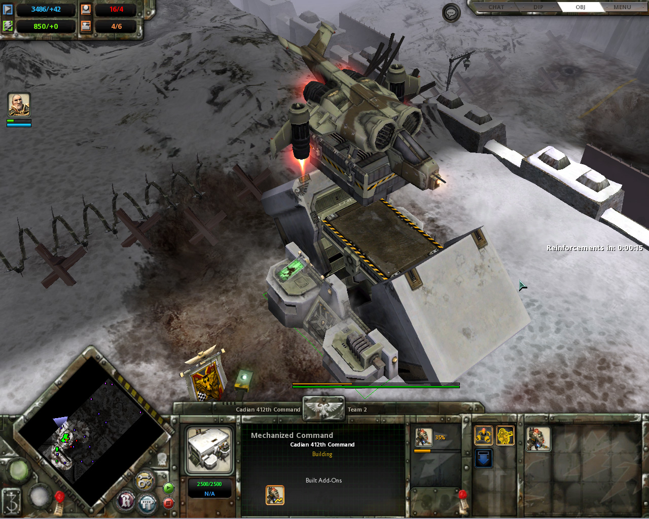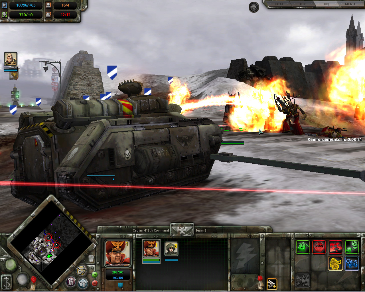 キャンペーンモードのステージは,雪の降り積もる縦長のマップで,登場する敵は真っ赤な服が印象的なChaos Marines。序盤は敵の波状攻撃が来るので,本拠を後にしての遠征はしづらいが,保有できるユニット数に上限があるので,うまくやりくりしよう。