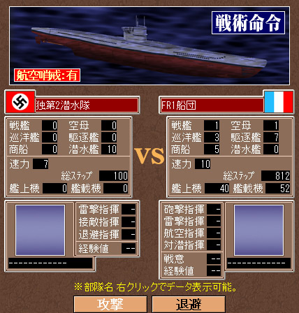 | 戦略級ゲームでありながら,たまにえらく細かいところまで指示可能。まあUボートは確かに,1隻1隻が戦略兵器なわけだが | |
