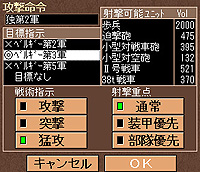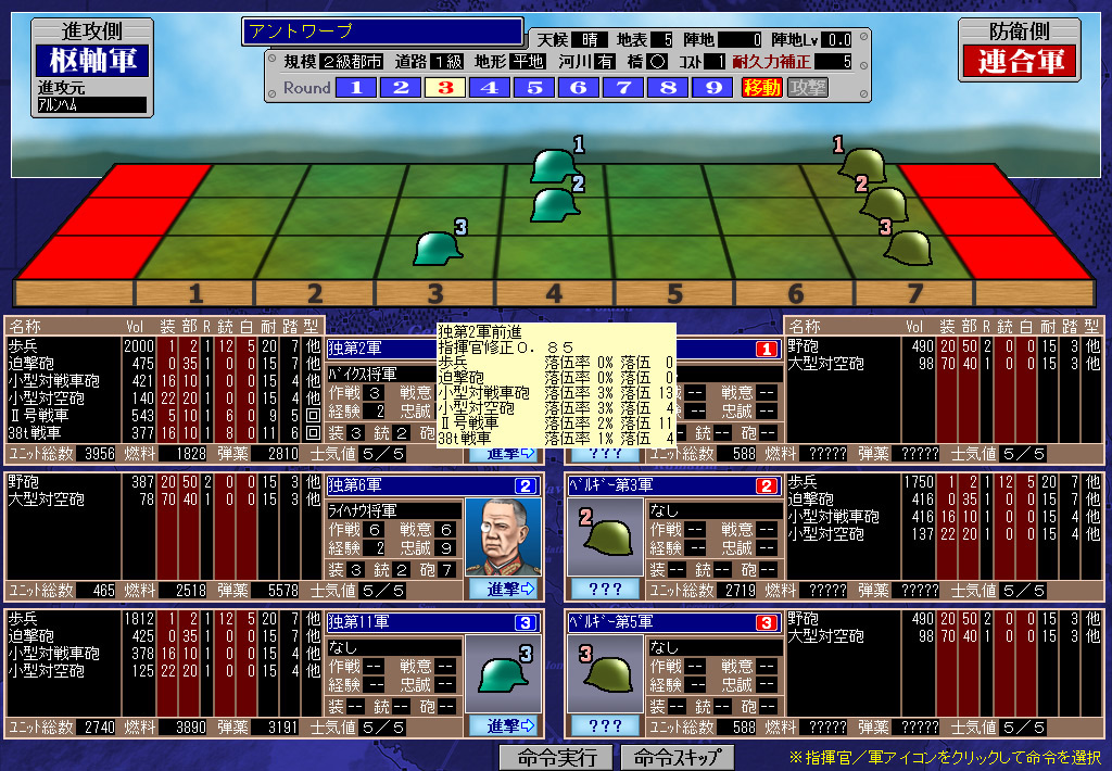 | 陸戦マップで,攻撃先根拠地を指定しているところ。地形と天候,道路の質や橋の有無が戦闘効率に大きく響く | 兵器ごと,地形ごとに落伍率が算出され,部隊が前進/後退するたびに戦力が減る。故障率が効いてくる場面だ |