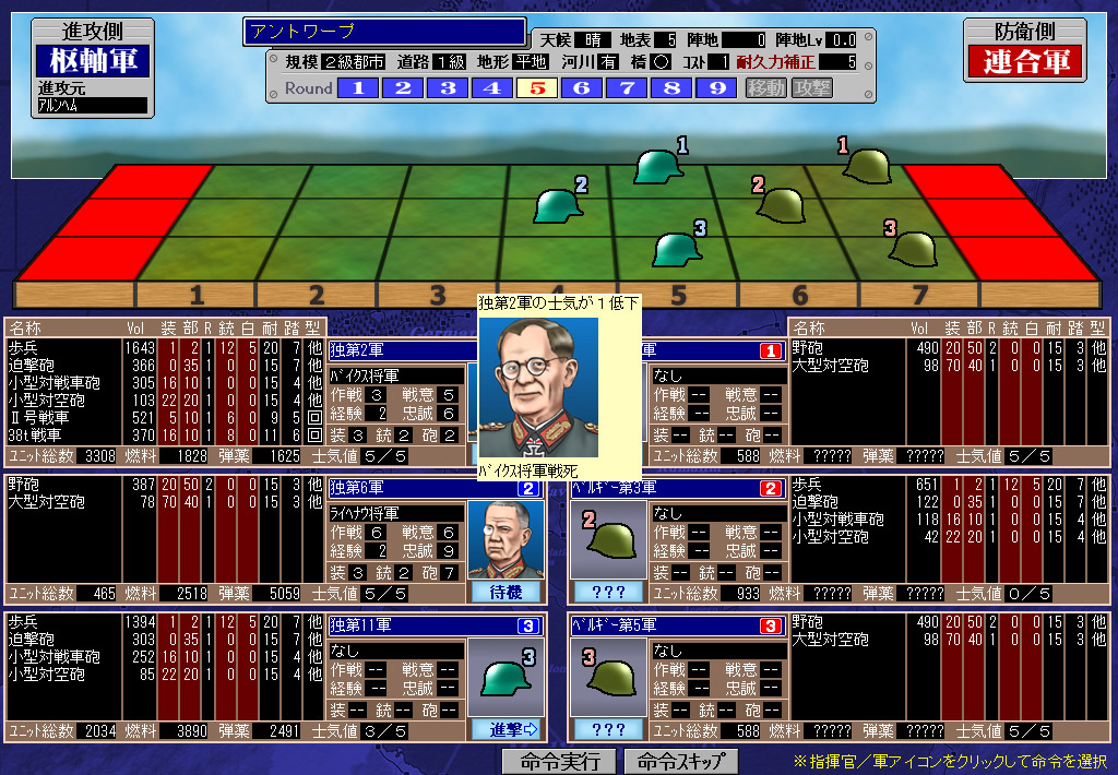 ユニットの損害とは別に,部隊には「戦意」が設定されていて,これが下がると戦闘を続行できなくなる。部隊に指揮官を設定しておけば,その能力に応じて戦闘開始時点での士気が上がるほか,戦闘中に低下した分をある程度回復してくれる。このゲームでは,優秀な指揮官を多く持っていることが,ドイツ軍の強さの表現ともなっているのだ。
