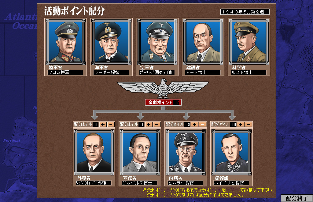 動員できる全要素を活用して,ドイツを勝利に導くのがプレイ目標であり,イギリス・フランスを早期に打倒して戦争を終わらせるのも,ソ連・アメリカをも相手にして真の勝利を目指すのも,クーデターを起こされて政権から滑り落ちるのもプレイヤーの手腕次第なのだ。