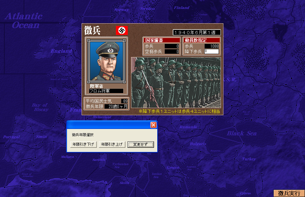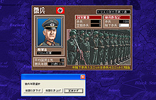 | 外交/宣伝/諜報/治安の4分野は,力の入れ具合をポイントで調整する。兵器開発などと同じく,±30%の範囲でポイントを増減させることにより,コマンド数などが決まる | ドイツの泣きどころは,やはり人的資源である。徴兵年限を引き下げていくと,手っ取り早く戦力が手に入るものの,国民士気に影響する。たぶんプレイヤーの士気にも |