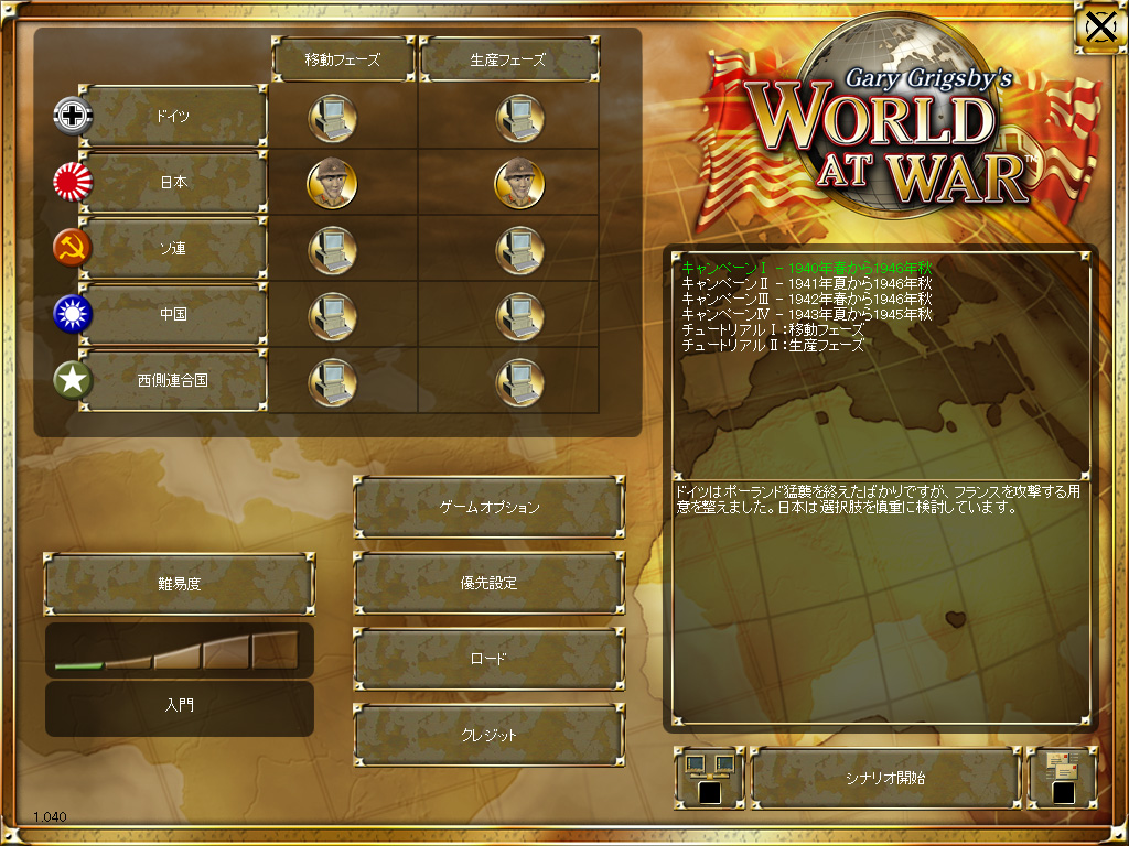 | シナリオは1940年〜43年に始まる4本。設定はすべて史実に準じており,フルキャンペーンといえる1940年春からのシナリオの場合,ドイツはフランス侵攻の準備を終えている |