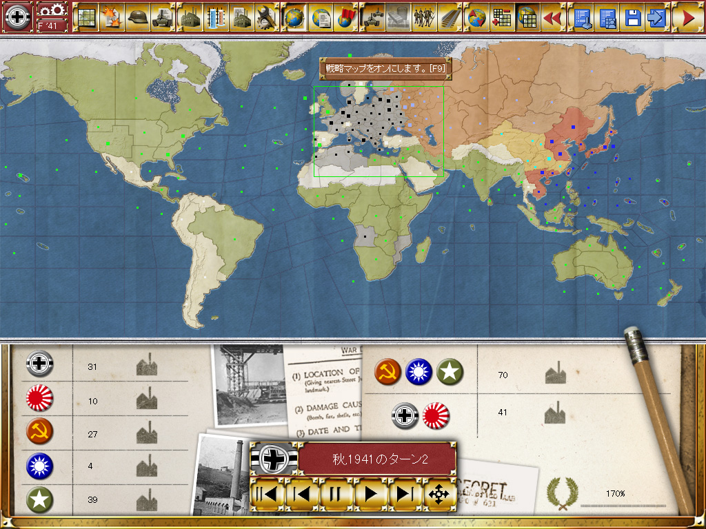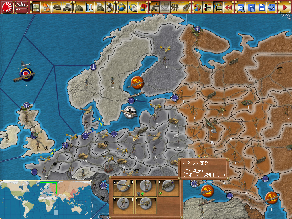 ともあれ,歴史性を重視したうえで手短に第二次世界大戦キャンペーンを遊べるゲームというのは,ほかにあまり例を見ない。実際,Pentium 4/3.2GHzを搭載したPCで試してみたところ,AI率いる4勢力の思考/行動時間は長くて3分,短いときは1分で終わる。自分の手番にたっぷり10分かけても,5時間あればまず終わるのだ。