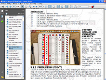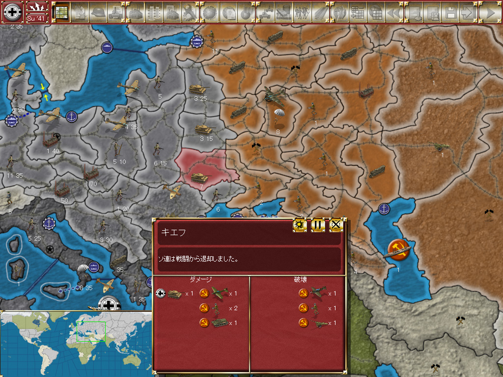| 戦闘結果の要約表示。民兵以外のユニットは1ヒットでダメージ状態,2ヒットで除去される。アニメーションを切ればゲームはスピーディに進む | 勢力としてのドイツの支配領域を見る画面。国家としてのドイツ領域(上半分)とイタリアの領域(下半分)が別に管理されていることが分かる |