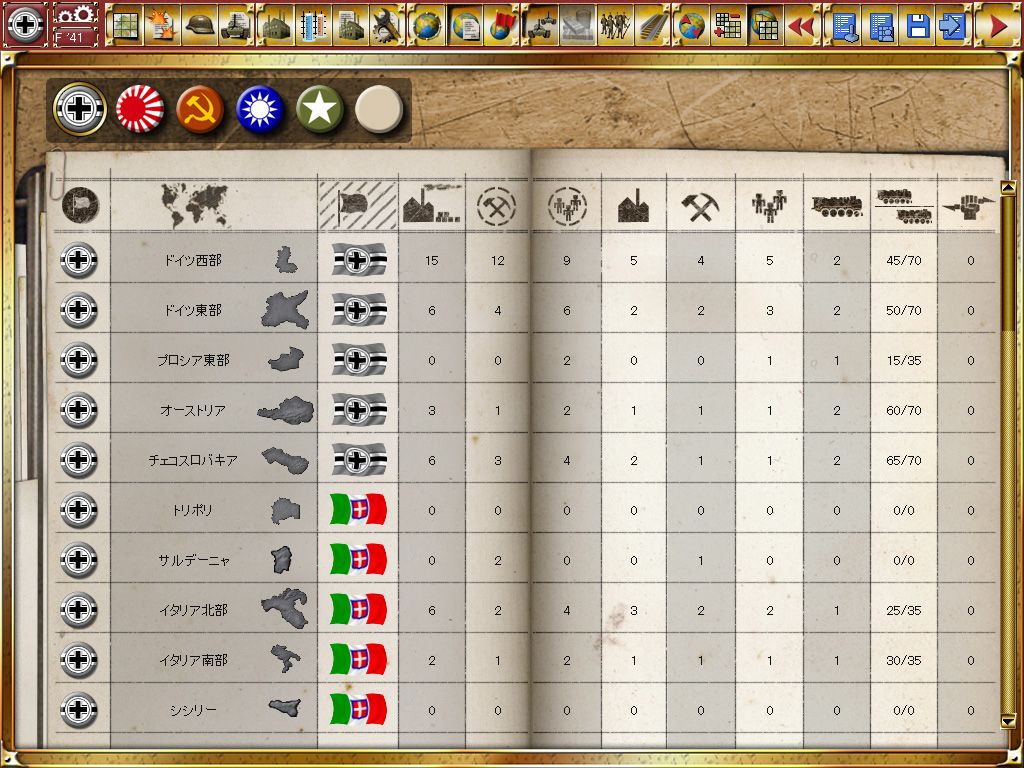 プレイヤーが担当するのは,第二次世界大戦に参加した五つの勢力。その内訳は,枢軸側のドイツ,日本,連合側の西側連合国,ソ連,中国となっている。ドイツプレイヤーはイタリアやヨーロッパの枢軸諸国,フランス降伏後のヴィシー政権もプレイする。西側連合国は,米・英・仏・カナダ・そのほかの英連邦諸国(主にインドとオーストラリア)だ。ただし,これらの複数国で構成される勢力は,政治やユニット生産では国ごとの操作となる。