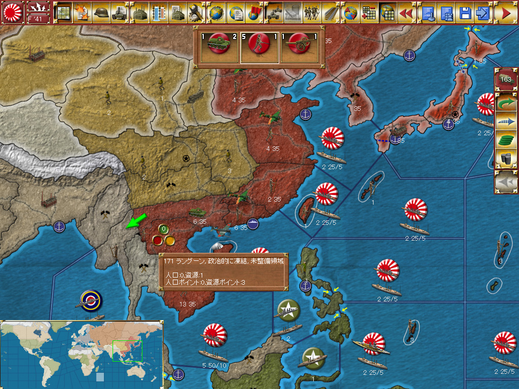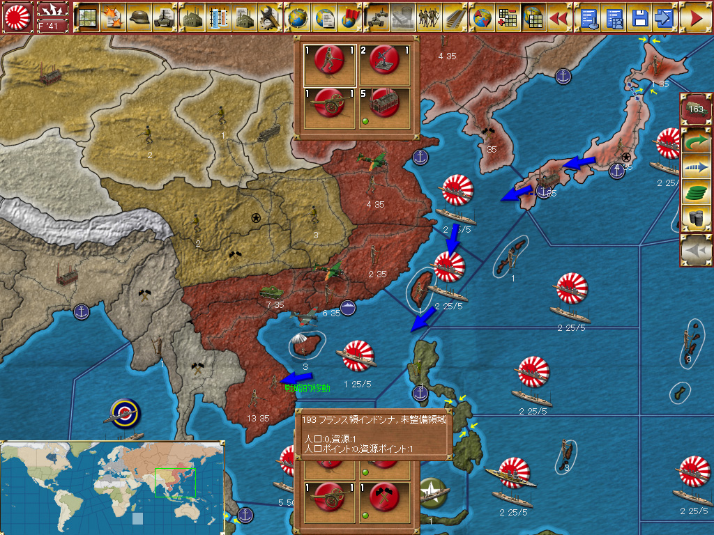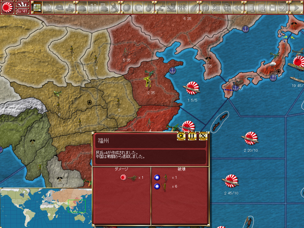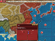 | 中国戦線の場合,日本軍が侵攻した地域には自動的に中国側民兵4ユニットが配備される。支配領域からの収益を阻害する「パルチザン」も発生しやすく,大陸支配はかなり困難 |