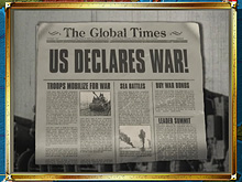 | 勢力の参戦や降伏/首都陥落といった大事件が起きると,モノクロニュース映画風のムービーが流れる。ナレーションは英語のままだが,雰囲気はよく感じられる |