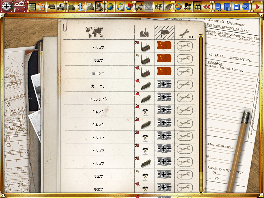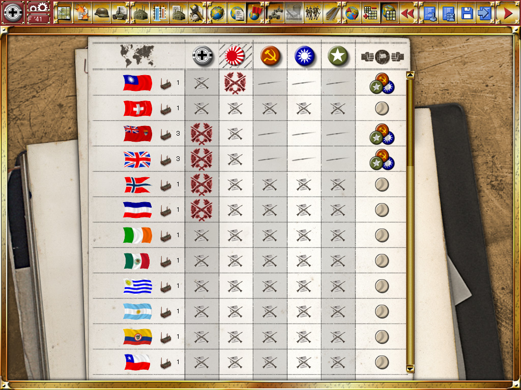 | 国家間の関係は表の形で参照できる。資源や進撃経路の都合に合わせ,中立国への宣戦も可能だが,敵陣営がそれに呼応して進出してくると,敵の勢力を伸ばすことにもつながってしまう | 工場・資源・鉄道は,敵から奪い取るとその時点で2段階破壊される。修復には補給ポイント2が必要だが,すぐ奪還されればコストは無駄に。修復はタイミングを考える必要がある |