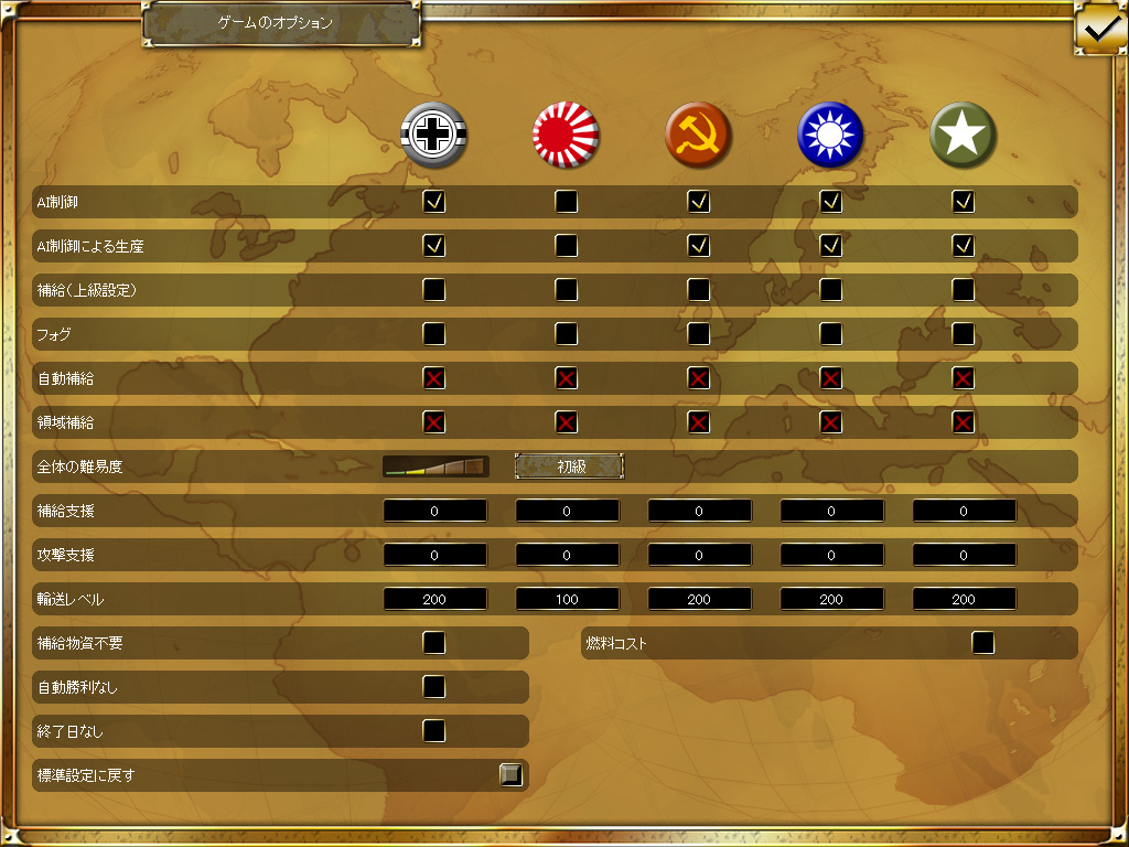 ただ,その結果として破天荒に暴れまくることはしにくいし,陣営設定は変えられないので,「アメリカが中立を保った場合」「ソ連が枢軸側で参戦した場合」といった歴史if的な状況は設定できない。プレイバランスは,あらかじめ与えられる補給ポイント量の違いとして段階的に調整可能なので,ゲーム的なダイナミズムを求める場合は,もっぱらそれを活用することになるだろう。