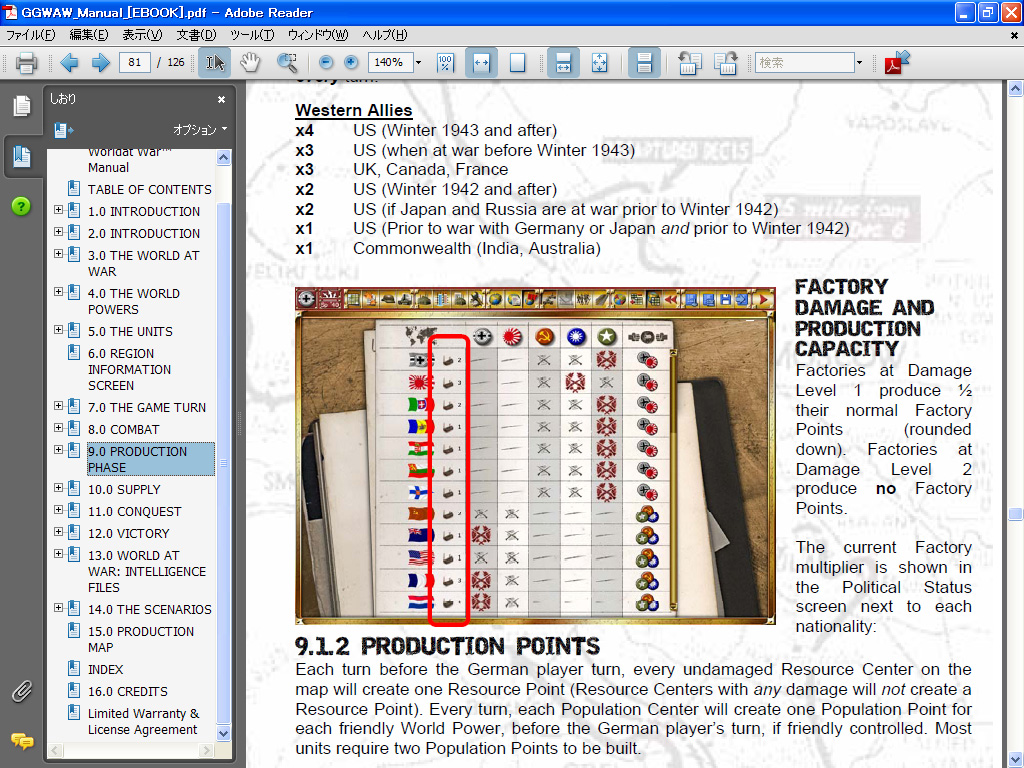| 英文マニュアルのPDFファイルは章ごとの目次も備えており,必要な情報を探しやすい。「実際に使える工場ポイントは,時期や状況によって何倍かされる」といった重要なルールもあるので,ざっと目を通しておきたい |