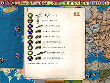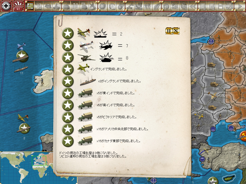 | 戦略マップでは軍隊の配置状況のほか,工場の支配数も見られる。これは補給ポイントや軍事ユニットの生産力に関わるだけでなく,勝利条件の一つとしても扱われる |