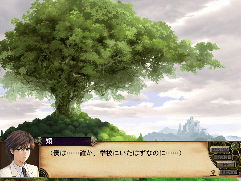 | 学校内で急にめまいを覚えて意識を失った翔が気づくと,そこは見たこともない光景だった。異世界ものでは割とおなじみの導入部だ |