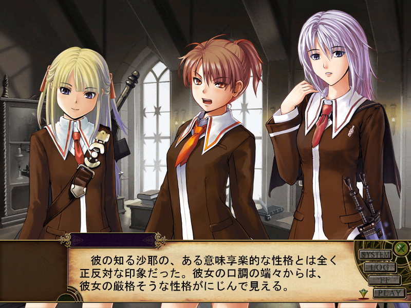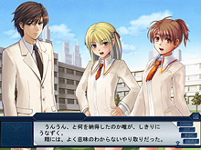 | 現実世界におけるクラスメイトとの会話シーン。翔の幼馴染みの唯(中央)と,スポーツ少女の沙耶(右) | 異世界にいる,唯そっくりの悠香(左)や沙耶そっくりの紗姫(中)。ただし,それぞれ性格はかなり違う |