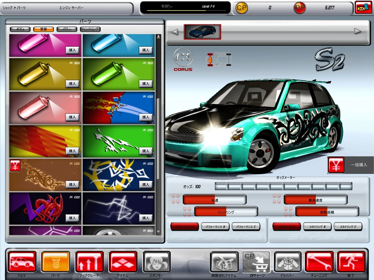 車の構成要素はボディ,パワー,ハンドリング,塗装に分類され,これらを変更することで,愛車のオリジナリティを出せ,性能も上げられる。パーツ類の購入には,PP(プレイポイント)を用いる。PPは,VSもしくはFUNモードをプレイすることで,EXP(経験値)とともに得られる。対戦すればするほど(そして成績がよければよいほど)多くもらえ,愛車をより強化しやすくなる。