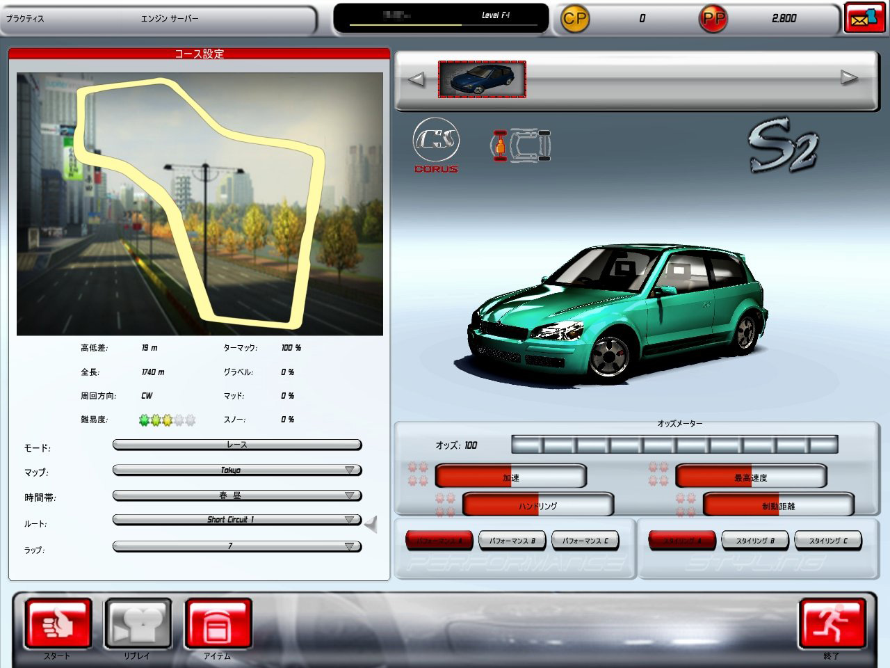 各レベルは,さらにI〜Vの5段階に分けられており,ほかのプレイヤーと走ることで得られるEXPが一定値になると,I→II→III……という形で上がっていく。このランクがVまで上がるとライセンステストを受けられ(受験用のアイテムが必要で,PPで購入する),それに合格するとF→Eという形でレベルアップする。