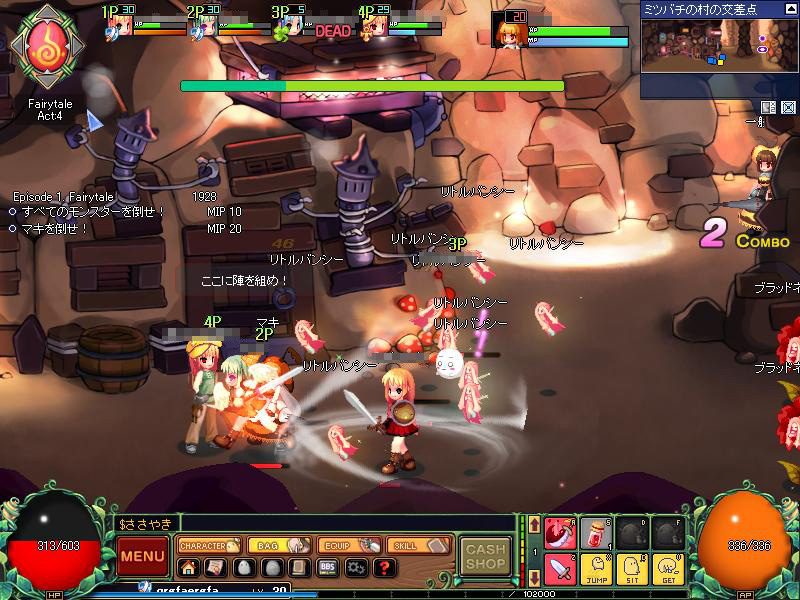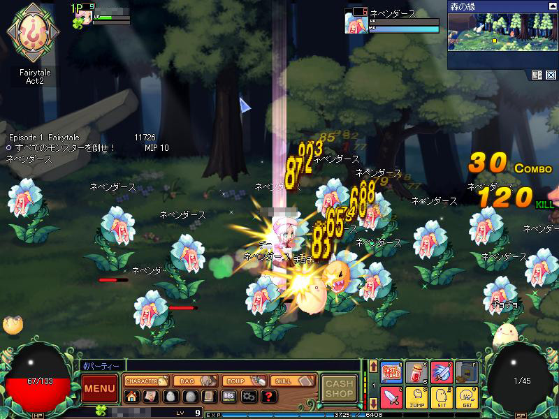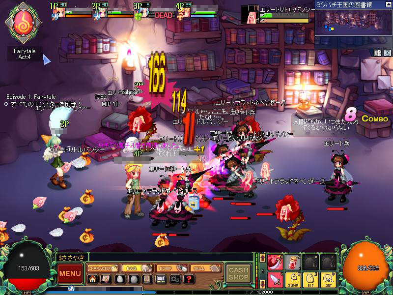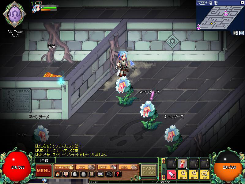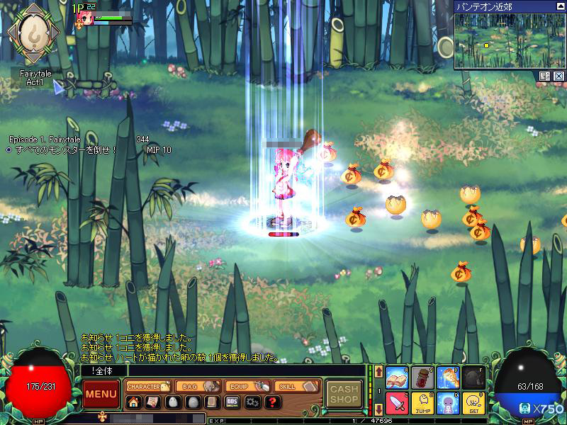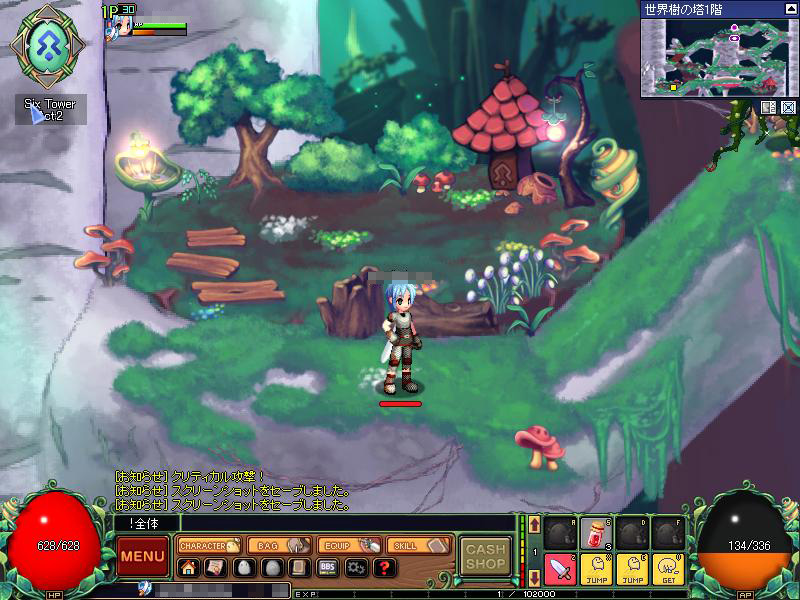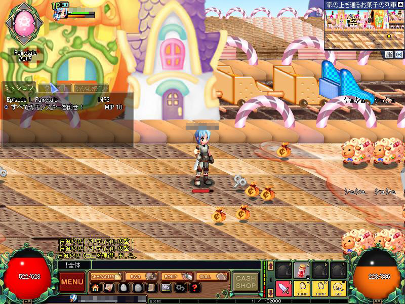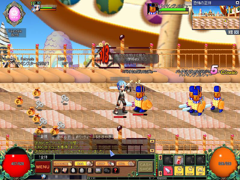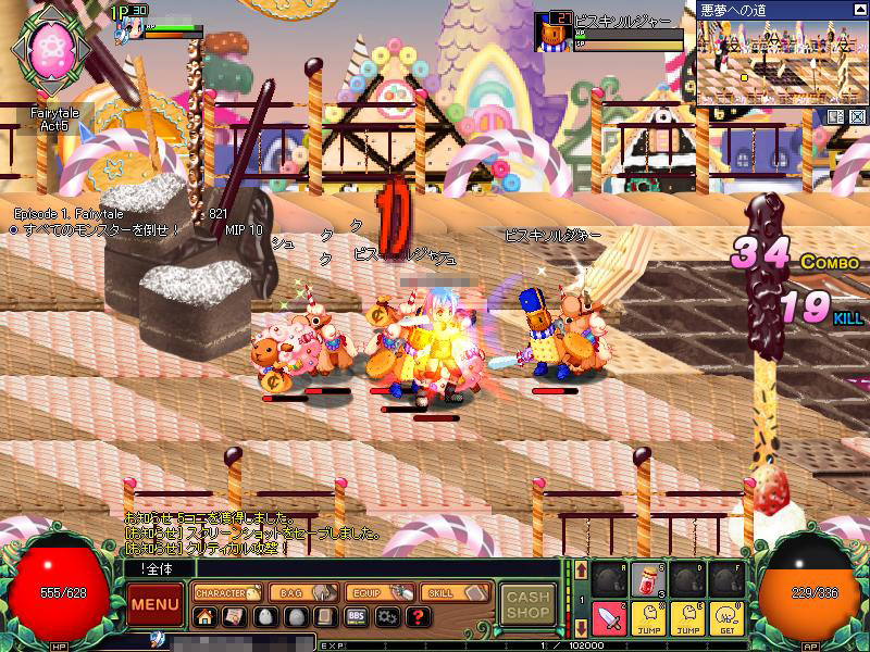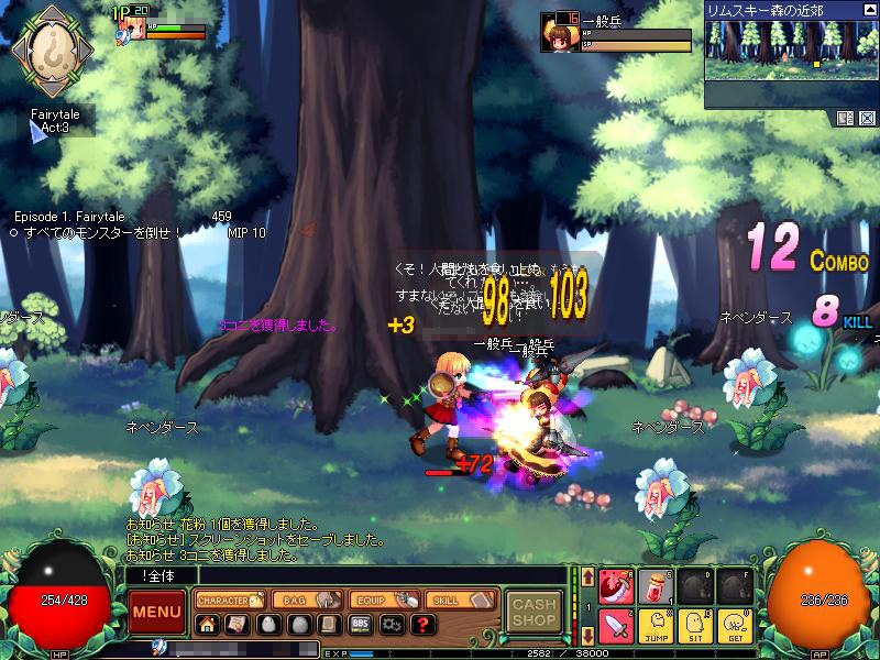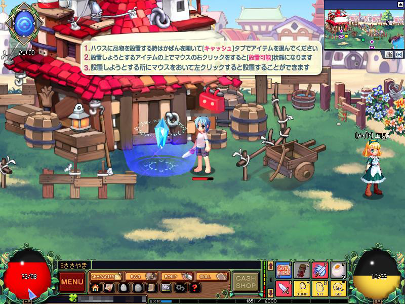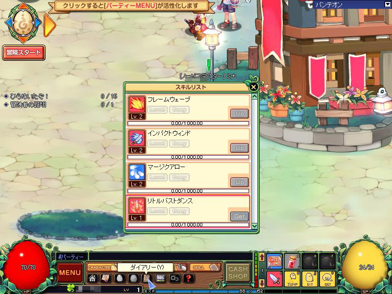 | 一定レベルに到達するとタウンで購入できるスキルもある。例えば,リトルバストダンスLv.1を購入するには,キャラクターレベルが5以上である必要がある | Casting Words(詠唱)タイプのスキル。この場合,ミリネと入力することで魔法が発動する。タイプミスという難点はあるが,魔法っぽい気分は味わえる |