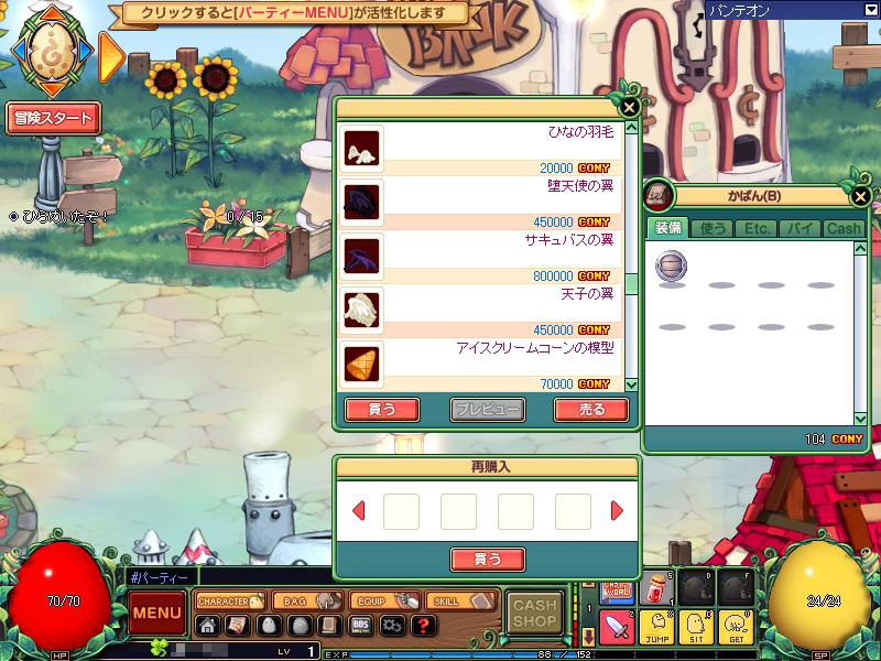 PI STORYは,キャラクターメイキングで外見を工夫できるのはもちろん,装備品と別に,愛らしい洋服をタウンのショップで購入できる。キャラクターの雰囲気に合わせて,羽を付けたり,ワンピースを身に着けさせたりできる。かっこいい洋服をチョイスして,ダンジョンで自分のキャラをアピールできるような個性を演出しよう。