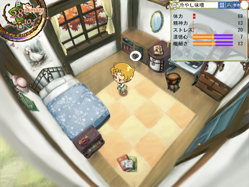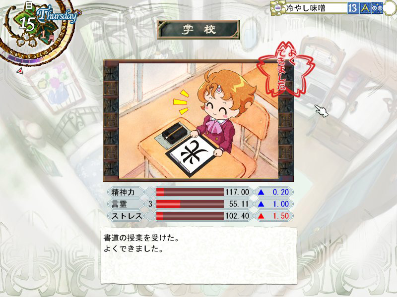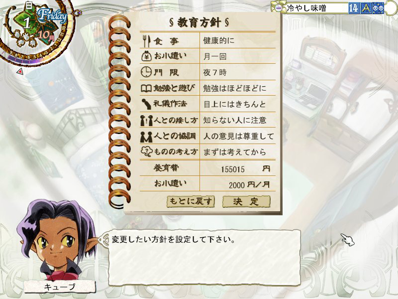 | 教育方針は1か月間変更できないので,習い事やアルバイトの時間が制限されてしまう門限の設定には注意が必要だ。また,学校での授業と部活,習い事とアルバイトには「よくできました」などの3段階の評価がされ,それに応じて能力が増減する | |