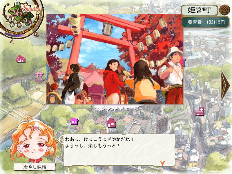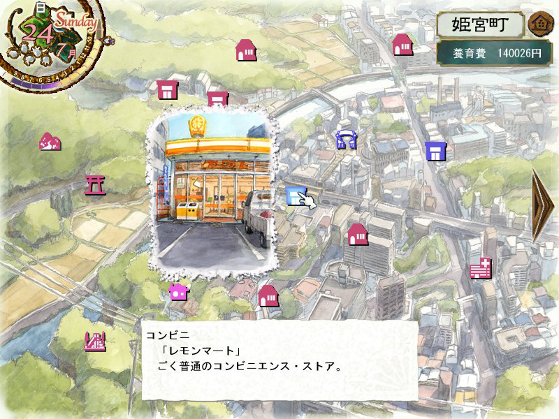 また門限までは,娘とともに街に出かけられる。街では,娘の能力を上げたり,ストレスを下げたりできる各施設が利用できるほか,各種アイテムを購入できる。そのほか,特定の期日/期間ではイベントが行われている場合もあり,タイミングよく参加できれば娘の能力とストレスに大きな変化を与えられる。休日は娘の意志に任せて「自由行動」を取らせて,独立心を養うことも可能だ。