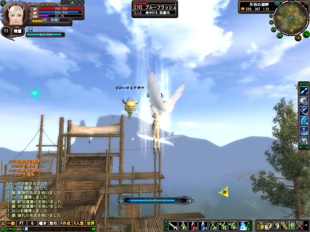 「飛行」は本作における大きな特徴で,移動手段として使用できるのはもちろんだが,戦闘時に複数のモンスターがアクティブになってしまった場合など,上空に回避する手段としても使える。なお,エルフは最初から飛行できるが,ほかの種族はレベル30で発生するクエストをクリアすることで飛行可能となる。