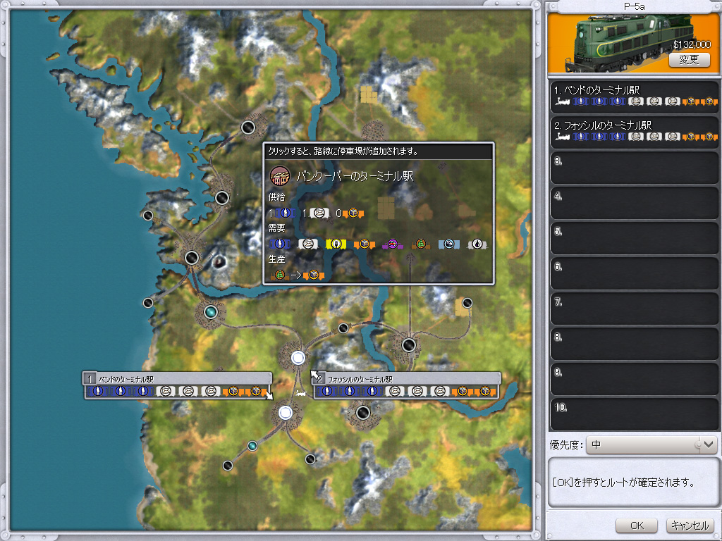 すべての積荷は「需要」と「供給」で示される。都市には「旅客」「郵便物」の需要と供給が両方あるので,大都市同士を接続して客車と郵便運搬車を用意すれば簡単に利益が出る。さらに発電所のある都市には油田から「石油」を,製紙工場には「木材」を,新聞社には「紙」,といった具合に物品を運び込めば,みるみる利益が上がり笑いが止まらないだろう。