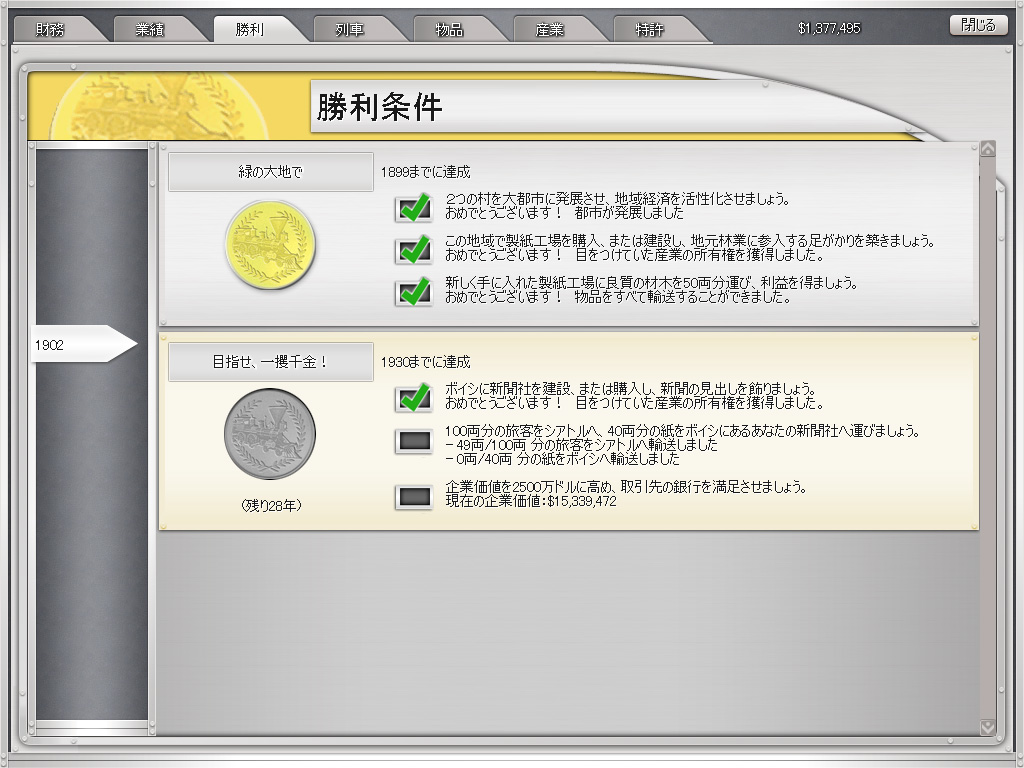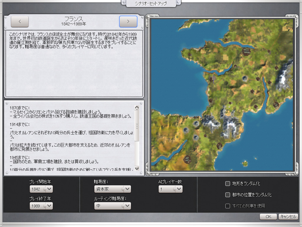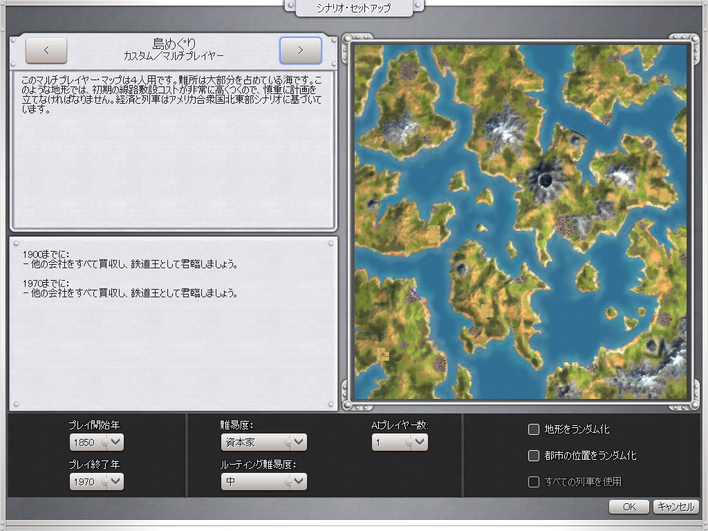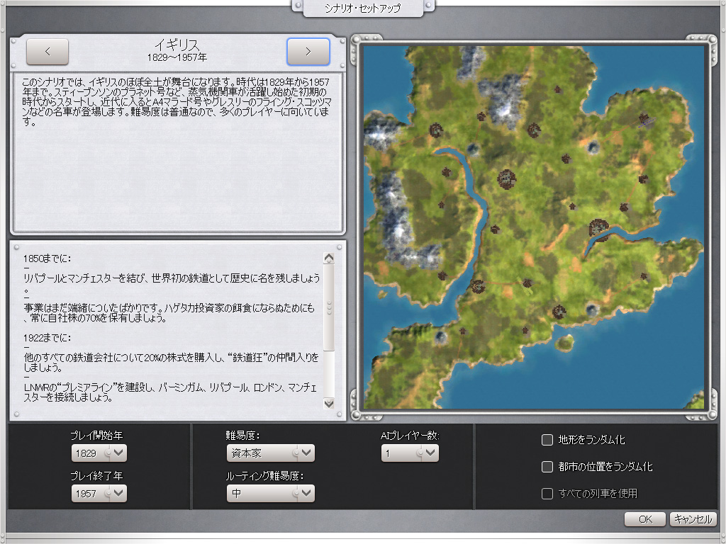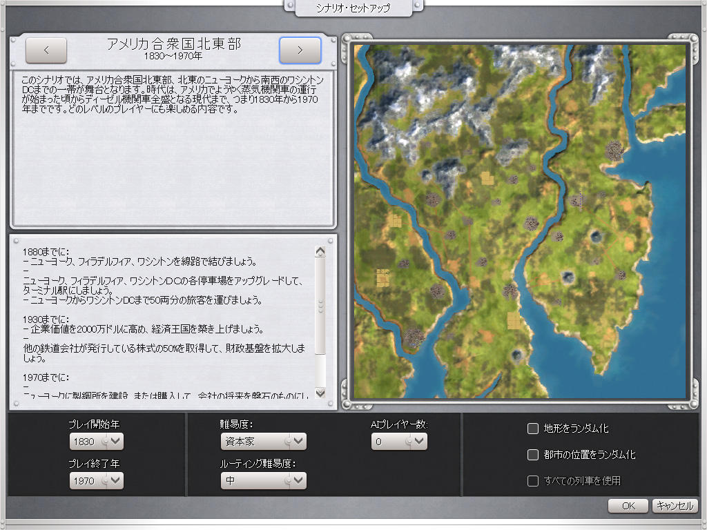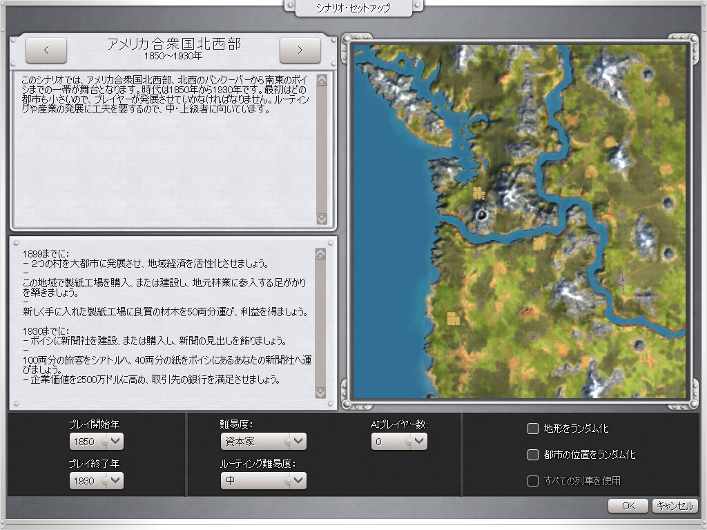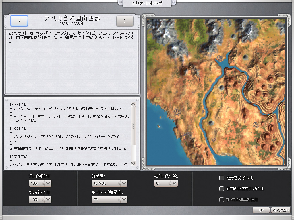 7種類のシングル用マップには,それぞれ「勝利条件」が設定されている。「1930年までにロサンジェルスとラスベガスを線路で結ぶ」などの内容で,まったく無視して好きに遊んでも,条件達成を第一に遊んでも構わない。ただし,いずれも血の煮えたぎる興奮モノの条件ばかりなので,ぜひ挑戦してもらいたい。マルチプレイ向きのマップも8種類用意されているが,基本的に対人戦や対AI戦には15マップすべて使用可能だ。